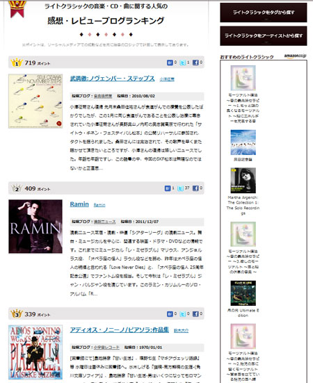 ▼ 無題 レビューブログからお知らせをいただきました。こんばんは毎日、毎日暑くて困りますね; 本が溢れそうになったので本棚を新調し組み立てていたら汗だくで Tシャツが『え? そのままお風呂に入ったの?』状態になりました orz さてさて、そんなことはいいとして、今回もレビュー記事行ってみましょうか! 今回ご紹介するのは……ランキングサイト『bestmania(ベストマニア)』の新しい関連サイトです。 ゲームや映画などに続き、今回『音楽情報に特化したキュレーションサイト』が誕生いたしました~。 すごい勢いですねぇ~! でもレビューサイトが増えるのはいいことだ!! 購入の参考にもなりますし、新たな出会いにも期待できますから♪ で、今回私が紹介するジャンルは『クラシックマニア』の『ライトクラシック』ジャンルです。 ライトクラシックの音楽・CD・曲に関する人気の 感想・レビューブログランキング 栄えある一位は…… 武満徹:ノヴェンバー・ステップス です。 『文化勲章を受賞した小澤征爾の若かりし頃の名盤』とレビューされている作品です。 ライトクラシックというジャンルを聞きなれないのですが、視聴サイトで聞いてみましたが…… 聞いてみると素晴らしいかったです!! 二位は Ramin このアルバムを出されたのはミュージカル俳優さんらしいのですが な、なんと私の大好きな『オペラ座の怪人』のラウル役や、25周年の記念公園ではファントム役までされたという方。 ファントムって滅茶苦茶私好みなんですよね~。格好いいし、ヤンデレ~な男性は大好きです! 三位は アディオス・ノニーノ/ピアソラ:作品集 今年の4月に発売された作品のようです。 タンゴの曲が多いようで、アダルティーな雰囲気の漂うアルバムですね。 ……で、今週の売上ランキングっていうのも気になったので見てみたら…… 3位がなんと……『0歳からの育脳クラシック』……0歳……だと……!? 若いうちの方がいいとは言いますが、ちょっと早すぎな気も…… あ、でもお腹の中にいるときから聞いているのだから遅いの、かなぁ? いや、でもやっぱり……「早い! 早いよっ!!」ですね; みなさんもよろしければちょっと覗いてみてくださいね~いい作品に出会えるかも!! | PR |