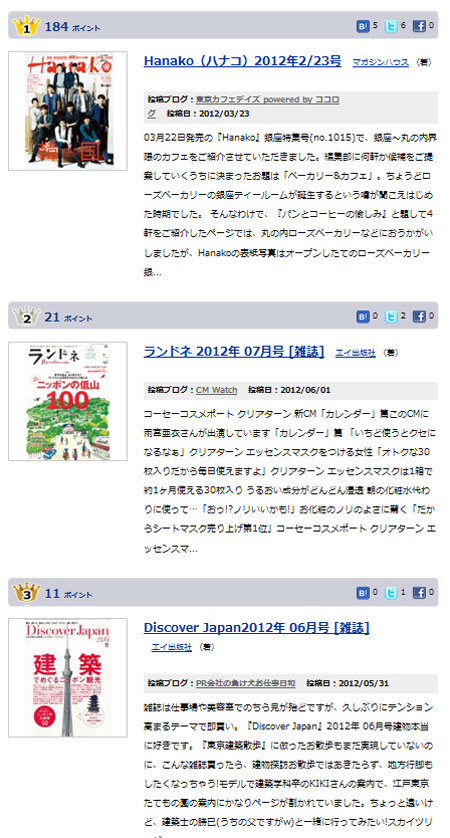 ▼ 無題 レビューブログからお知らせをいただきました。続いての紹介も『bestmania(ベストマニア)』の関連サイトのご紹介です。 今度オープンしたのは……本・書籍情報に特化したキュレーションサイトです!! 本・書籍はゲームとかに比べるとまだまだですが結構読む方なので嬉しいですね♪ で、皆様に見ていただいたのが旅行関連雑誌に関する人気の 感想・レビューブログランキング です。 ほら、もう夏休みも始まりますし……ね? そんな訳で旅行ガイドブックマニアの旅行関連雑誌ジャンルのランキングですよ~。 一位は Hanako(ハナコ) 2/23号 のレビューです。 私、今知ったのですが Hanako って、旅行雑誌だったんですね; オレンジページとかああいった感じの女性誌だと思っていました: いずれにしても、Hanakoコラボのジュースはハズレがなくて美味しいです。 二位は ランドネ 2012年 07月号 のレビューです。全国の低山を紹介した号のようですね。 低山なら体力のない人にも、お子様にも、お子様を背負った方にもおすすめできますよね~。 ……ただ、今の暑さに登山はご遠慮したいと思うワタクシでございます orz 三位は Discover Japan2012年 06月号 です。この号は建築特集号です。 スカイツリーに関する「秘密」情報や名建築50選が載っていたりと建築ファンにはたまりませんよね!! 因みに同ジャンルの今週の売上の1位と2位は共に Hanako でした。 おめでとうございます!! 私も今年の夏はどこかに……と思いましたが、去年、屋形船に乗りました。 ……今思い出してもニヨニヨが止まりませんがww あれ以上にトキメク夏はもう来ないだろうと思いつつ夏コミも終わって九月・十月くらいに一人旅にでますよ。 勿論、薄くて高い本を買いに!! みなさんも、旅行雑誌をみて今年の夏の計画をしてみませんか!?