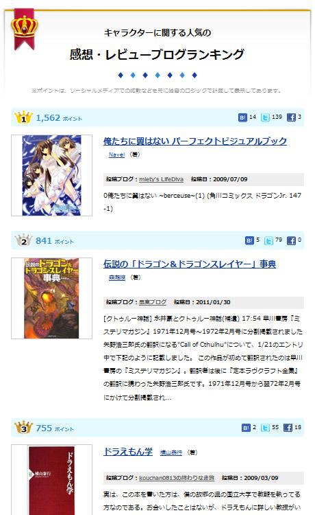 ▼ 本・書籍情報に特化したキュレーションサイトがオープン レビューブログからお知らせをいただきました。本日ご紹介するのは、毎度お馴染みみんなのおすすめBest3でつくるランキングサイトの 『bestmania(ベストマニア)』の関連サイト様のご紹介です。 今度は本・書籍情報に特化したキュレーションサイトがオープンしたようなので私も覗いてきました~。 今回は、写真集・サブカル・エンタメ本マニアのキャラクターというジャンルの感想・レビューランキングです♪ さてさて、では早速ランキングを…… 1位は、『俺たちに翼はない パーフェクトビジュアルブック』です。 navel から発売された『俺たちに翼はない』の公式ファンブックのようなものですね。 ゲームCGはもちろん、世界観のガイドや描き下ろしイラストやショートストーリーなども満載♪ というお得品となっているそうです☆ 公式見て、グレタガルドの国王となのる某狂人さんにはぁはぁ…… 眼帯萌はないのですが、この人眼帯なくても片目隠れだよね!! そして、一般向けにRというのもあるらしいですがRというと鬼畜眼鏡を思い出します…… orz 2位は、『伝説の「ドラゴン&ドラゴンスレイヤー」辞典』です ファンタジーストーリーに欠かせないドラゴンという存在。あるときは諸悪の根源として、 あるときは神に近い神獣として、色々なパターンで出るドラゴンの辞典です。 面白エピソードなんかもあっておとくですよ~ 因みに、職場にドラゴンというあだ名の方がいるのでちょっと笑ったりww 3位は『ドラえもん学』 よくある考察とかの類の本ですね。 その人なりの解釈などは見ていて面白いのですが、完結していない作品を仮定の解釈をしてしまうと 物語が完結したあとに見ると結構恥ずかしいものです。 え……? 私のことですが、なにか? と今回はこんな感じです。一位がエロゲーのビジュアルブックというのが、さすがといいますか…… 嬉しいんですけどねww みなさんもきになるジャンルでのブログランキングを見てみてはいかがでしょうか?