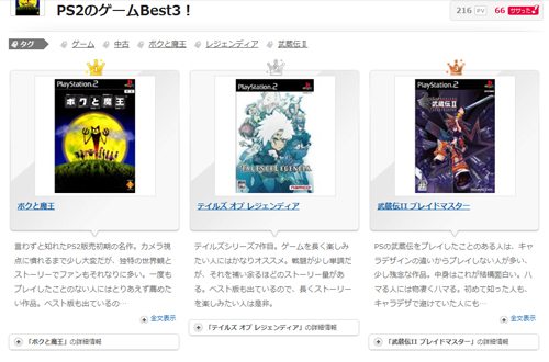 ▼ ベストマニア   レビューブログからお知らせをいただきました。約3週間ほど放置しておりまして申し訳ありません; その頃に行っていたゲームで未だにやっているのが ほしがりエンプーサ だけです。 しかも、アレ正確には乙女ゲーではないので乙女充してませんよ \(^ω^)/ ではでは気分を取り直しまして、レビュー記事のほういってみましょうか!! 今回ご紹介するのは以前にご紹介させていただいたベストマニアに関連する記事になります! あれですね、自分で好きなbest3を作って皆さんに見てもらったり、みなさんが決めたbest3が見えるサイトです。 前回は本・漫画ジャンルと音楽ジャンルでしたが、今回はゲームジャンル!! ヲタの本領発揮といいたいところですが、私結構マイナーなゲームがすきなんですよね。 メジャーで好きなのって言ったら……レイトン教授シリーズとか? デジモンも好きですが、最近のは無理です。デジモンワールドが一番でした。 あとは……もっぱらPC(子供は買っちゃダメーなヤツww)が好きだったりで、おすすめしにくいといいますか……(もごもご で、そんな私の おすすめのゲームのbest3とか見ても面白くないと思いますので、 ほかの方が決められたbest3をご紹介しますね♪ 中古で売っていたら迷わず買え!! しかも2000~3000円なら即買い!! PS2のゲームbest3 タイトルからして惹かれますね!! さて順に見ていきましょうか。 まずは一位に輝いた『ボクと魔王』から…… コレ昔からめっちゃやりたいんですけど、なかなか機会がなかったのですよね! ゲームにハマるとついつい腐ィルター掛かっちゃうので、名作を汚したくないっていうのもありますが; キャラクターが可愛いくて魅力的なキャラクターばかりで、ゲームレビューを見る限りめっちゃ良作だとおもいます!! 次に二位の『テイルズ オブ レジェンディア』 これって確か明日のナージャのキャラデザされていた方がキャラデザされたヤツですよね? キャラデザだったかは覚えがないのですが、確か制作に関わっている人だったとおもいます。 OPムービーは何回かテイルズ狂の姉妹ちゃんに見せてもらったりしていますし、キャラは大体わかるのですが…… 実はテイルズシリーズ恐怖症なのでこのくらいで……; 3位は『武蔵伝II ブレイドマスター』 武蔵伝の方なら体験版か何かでプレイしたことがあるのですが……よくわからないです;スミマセン。 キャラデザがキングダムハーツとかすばらしきこのせかいの方ですよね……? と簡単に触れるだけでしたがどうだったでしょうか? ベストマニアでは、ほかにも色々なbest3が公開されていますし、自分で作ることもできちゃいますよ! みなさんもぜひ作ってみてくださいね☆