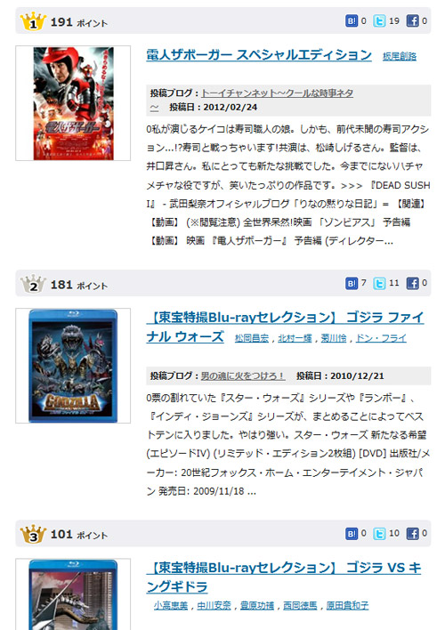 ▼ 無題 レビューブログからお知らせをいただきました。今回最後のご紹介は…… 以前ご紹介させていただいた『bestmania(ベストマニア)』の関連サイトです。 とは言っても前回はゲーム。今度は映画・DVD情報に特化したキュレーションサイトなのですがね; では、私が気になったランキングをご紹介しますね。 邦画DVDマニアの特撮映画ジャンルでのランキングです。 ……えぇ、特女ですから仕方ない。仕方ない……。 さてさて、1位は……電人バボーガー スペシャルエディション 私は知らないのですが、有名なのかなぁ……? 調べてみたら結構昔の作品のリメイク映画のようですね。 あきらめるな! 立ち上がれ! なんて、今時の特撮にはない熱さがあってきゅんきゅんします♪ 2位は……ゴジラ ファイナル ウォーズ ゴジラって言うとスペースゴジラとメカゴジラ(?)を見に行きましたがなぜか寝るんですよね。 ……でゴジラ登場する数分前に必ず起きていました。別に関係ないんですけどね。 3位は……ゴジラ VS キングギドラ またまた東宝作品。やっぱりこういう怪獣ものは東宝が良いのかな……? というか、特撮というとこういった怪獣系のほうが人気なのか?? かくいう私は余り怪獣系のは詳しくないです……orz モスラかわいい!! ぐらいの認識です。 私は、去年やったオールライダーのが面白かったですね! 次々と登場する主人公ライダー達の名前を民間人達が間違えることなく呼ぶのが印象的です。 あと『40飛び』もなくては語れないです。 劇場では見られなかったのですが、セイザーXの劇場版も好きです。 ケインが本編とは違う属性になってたり、性格がちょっと生意気だったり……。 後ね、冒頭の三人のバスケットはニヤニヤなしには見られない。 きゃっきゃな三人が見られるのは劇場版だけ! みたいなあおりがあってもおかしくない。 アドとシャーク隊長の距離も突っ込みましたが、何より…… 爆風で飛んだレミーとケインに駆け寄るアドが迷わずケインの方へ行ったのが酷い。 私だったら泣くわww レミーは本当に強いこだなぁ~。 そしてアドは本当に『戦える仲間』しか大切にしない感がバンバンだったなぁ~。最低だなぁ(※アドが一番好きです) でも、捕らえられた人々を助けるたっくんとリキの存在を怪しんでいたアドが心を解くという描写を見るところ、 アドも主人公と考えて良いのかな……? ……グランな方々とジャスティな方々はよく分かりません。 長々と語りすぎましたね orz 皆さんも是非、好きなジャンルの映画やDVDのランキングを見て新たな発見をしてみては!?